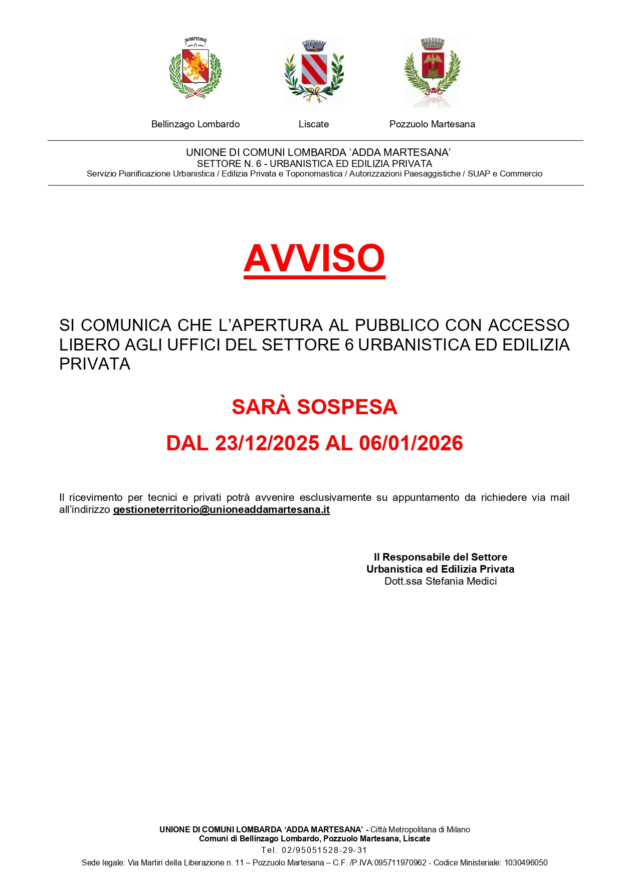 SOSPENSIONE APERTURA UFFICI SETTORE URBANISTICA ED EDILIZIA PRIVATA – DAL 23 DICEMBRE 2025 AL 6 GENNAIO 2026